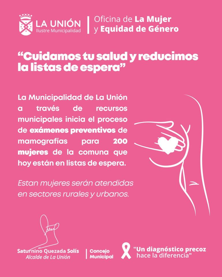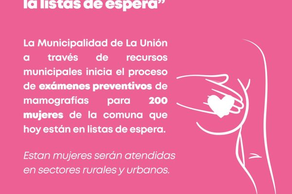 La Municipalidad de La Unión, a través de la Oficina de la Mujer y Equidad de Género, iniciará un importante operativo que permitirá reducir las listas de espera de mamografías en mujeres de la comuna, contribuyendo así a la detección temprana y prevención del cáncer de mama. Gracias a una inversión municipal de 5 millones…